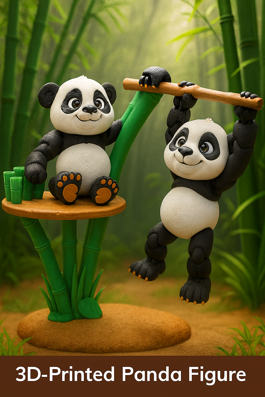 Bring playful charm to your collection with this 3D printed panda figurine set, featuring two adorable pandas enjoying their bamboo playground. One panda relaxes on a bamboo platform while the other swings from a branch, capturing the fun and joy of these beloved animals.