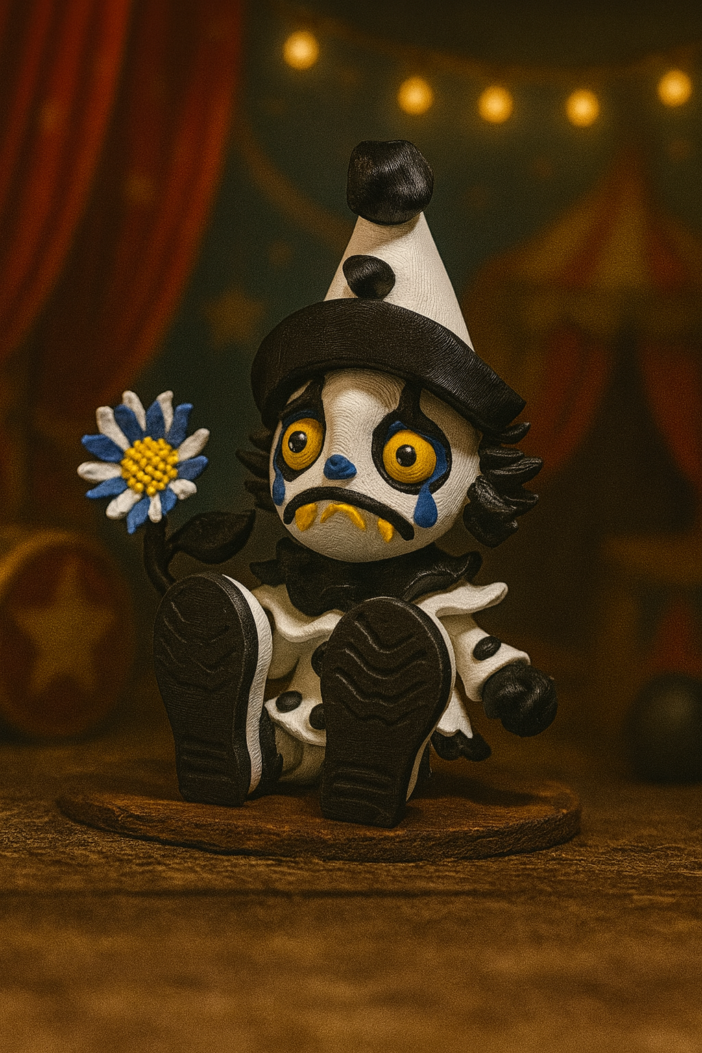 Bring circus nostalgia and gothic charm into your collection with this 3D printed Sad Clown figurine. Designed in a black-and-white harlequin outfit with oversized shoes, frilled collar, and a tall pointed hat, this clown holds a daisy while a blue teardrop falls from its eye—capturing the perfect mix of whimsy and melancholy.