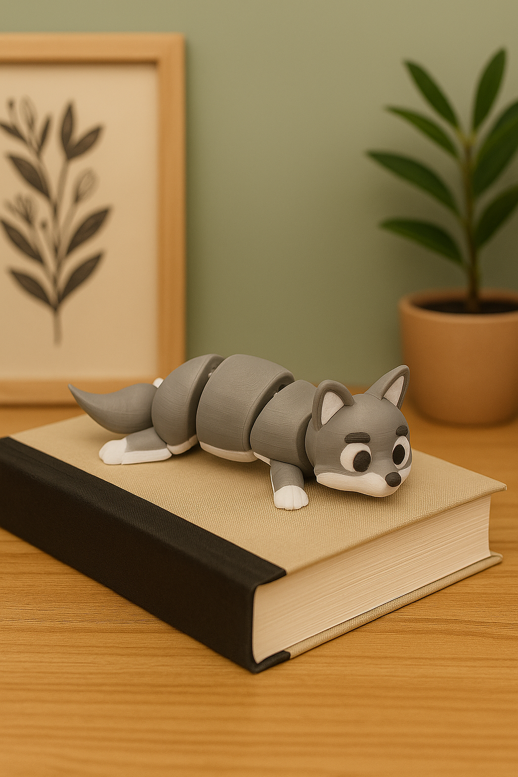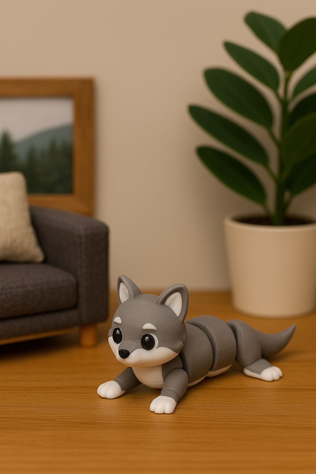 A cute articulated silver fox mini with flexible joints. 3D printed in high-quality PLA, no assembly required, wiggles and bends right off the printer. Perfect as a desk buddy, collectible, or gift!