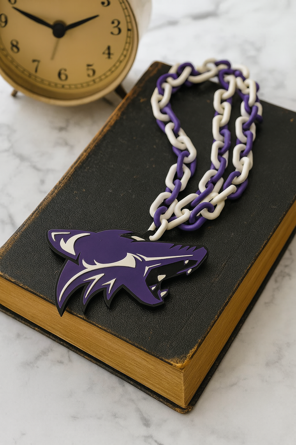 Unleash your inner wolf with this Purple Wolf Fan Chain Necklace, designed for fans who want to stand out. Featuring a fierce wolf head pendant in bold purple and white, this oversized chain makes a powerful statement at games, parties, and tailgates. The lightweight, durable design ensures all-day comfort while showing off your team pride or love for the wild.